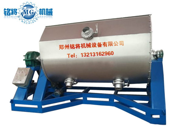 本產品采用U型外觀設計,內部采用雙層螺帶設計。即在水平的主軸上裝有兩條或多條輸送能力相同,螺徑不同,螺轉方向不同的螺帶。通常是當主軸轉動時,一條螺帶把物料從左至右輸送,另一條螺帶把物料從右至左輸送。因而在機內發生對流穿插混合作用,達到混合均勻的目的