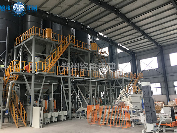 該生產(chǎn)線可在傳統(tǒng)常規(guī)配置的基礎(chǔ)上增加添加劑自動(dòng)配料系統(tǒng),玻珠及添加劑氣力輸送系統(tǒng),以及成品砂漿自動(dòng)包裝輸送碼垛系統(tǒng)。